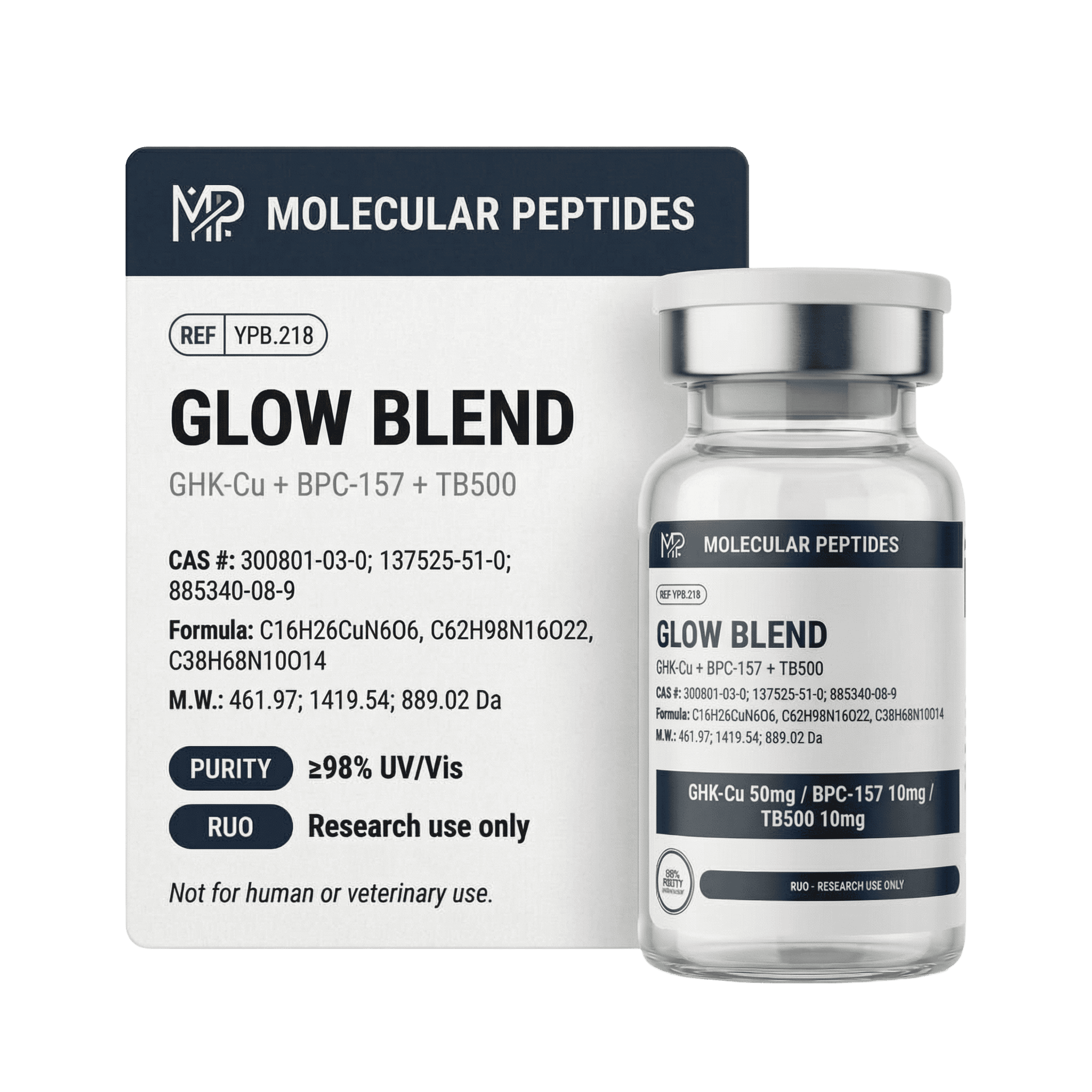 GLOW Blend – GHK-Cu (50mg) / BPC-157 (10mg) / TB500 (10mg) is multi-peptide research blend combining three tissue-research peptides. Structurally, it is a lyophilized blend of GHK-Cu (tripeptide-copper complex, MW ~403.9 Da), BPC-157 (pentadecapeptide, MW ~1419.5 Da), and TB-500 (43-amino acid peptide, MW ~4963 Da).