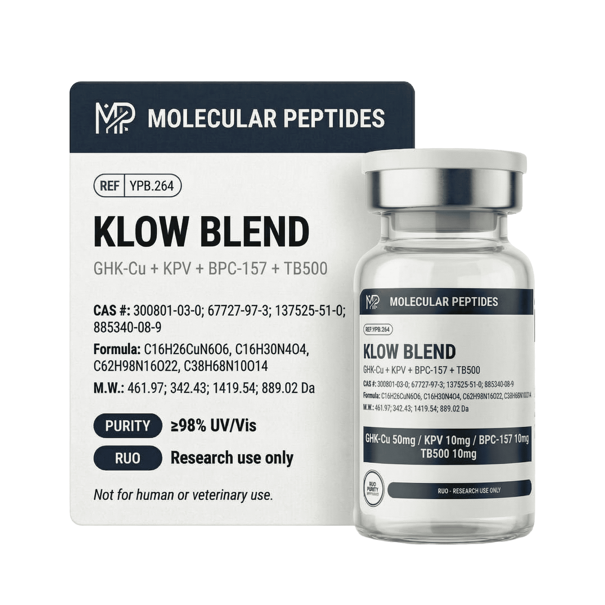 KLOW – GHK-Cu (50mg) / KPV (10mg) / BPC-157 (10mg) / TB500 (10mg) is multi-peptide research blend combining four tissue-research peptides. Structurally, it is a lyophilized blend of GHK-Cu (tripeptide-copper complex, MW ~403.9 Da), KPV (tripeptide, MW ~342.4 Da), BPC-157 (pentadecapeptide, MW ~1419.5 Da), and TB-500 (43-amino acid peptide, MW ~4963 Da).