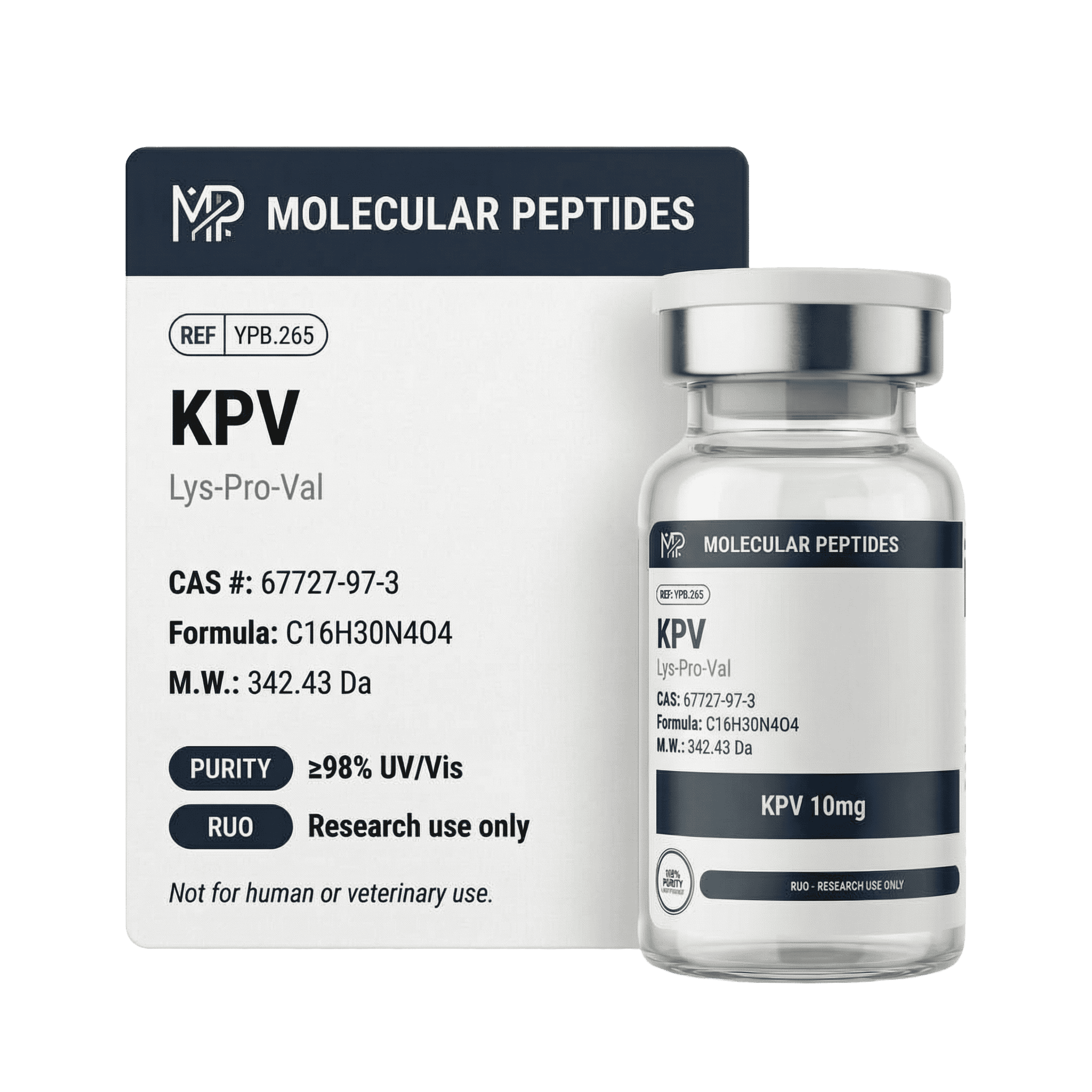 KPV (10mg) is anti-inflammatory tripeptide derived from alpha-melanocyte stimulating hormone. Structurally, it is a tripeptide (Lys-Pro-Val, MW ~342.4 Da) representing the C-terminal fragment of α-MSH.