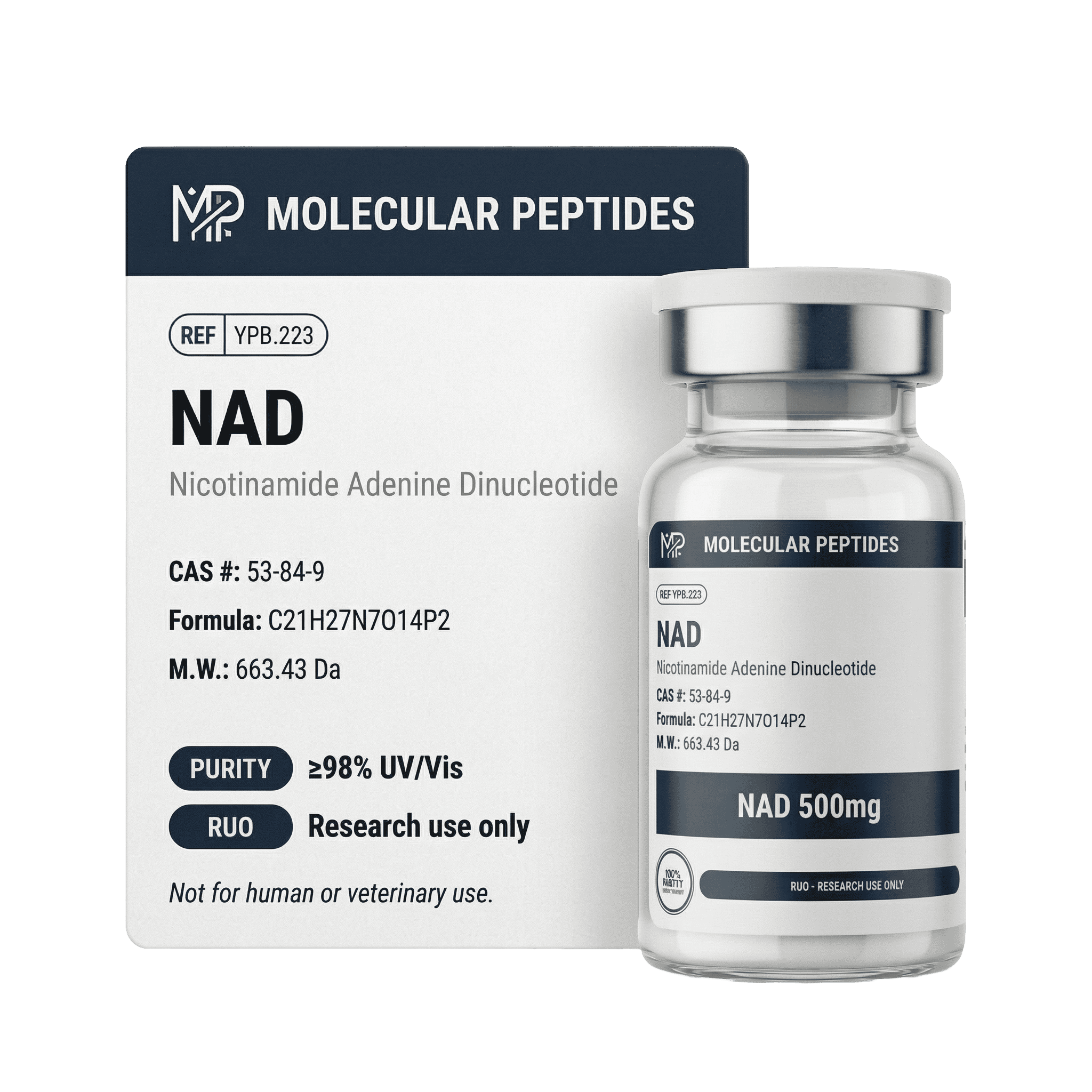 NAD+ (500mg) is essential coenzyme present in all living cells. Structurally, it is a dinucleotide (MW ~663.4 Da) composed of two nucleotides joined through phosphate groups — one containing adenine and the other nicotinamide.